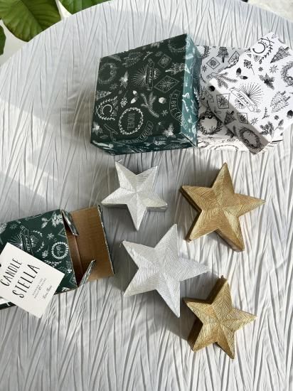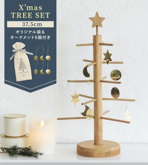 天然木で作られたツリーと、スター・ムーン・ラウンドの3種類の真鍮オーナメント6個がセットになった 組み立て式ツリーです。