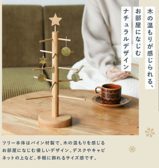 ツリー本体は木の温もりを感じる優しいデザインで、奥行き21cmのスリムなサイズはデスクやキャビネットの上にも手軽に飾れます。