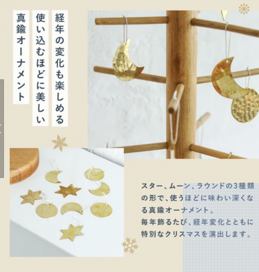 真鍮オーナメントは使うほどに深まる風合いが毎年のクリスマスをより特別なものにしてくれます。