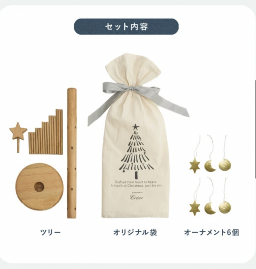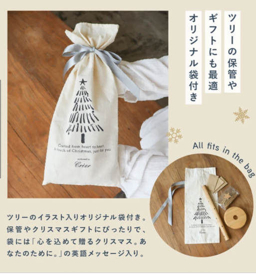 ツリーイラストが描かれたオリジナル袋付きで、保管はもちろんギフトにもおすすめ。