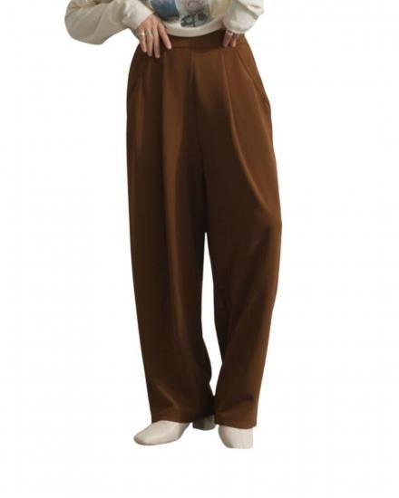 腰まわりにはタックを施し、立体的な丸みを描くコクーンシルエットに仕上げています。ヒップや太ももまわりをふんわりカバーしながら、裾にかけて細くなるラインで自然なメリハリを演出。ウエストはゴム仕様で楽ちんながら、前はフラットに見えるため、トップスインも美しく決まります。実用性と美しさの両立を叶えた、まさに“大人のきれいめカジュアル”にふさわしい一本です。